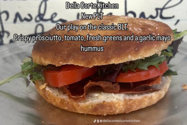 Savor the bold simplicity of our P.L.T. — crispy prosciutto, spring lettuces, tomato, and garlic mayo hummus on olive oil focaccia. Includes mixed green salad with a balsamic vinaigrette. Taste the finesse at DELLACORTE KITCHEN.